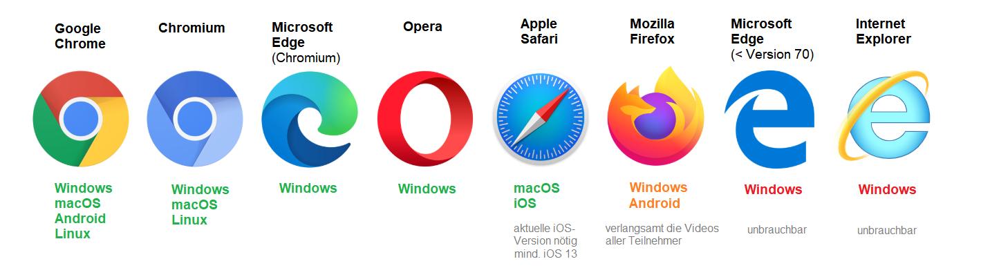 Der virtuelle Konferenzraum läuft direkt im Browser und nutzt dafür offene und sichere Standards. Sie benötigen einen modernen Browser, der Audio/Video-Übertragung mit WebRTC unterstützt.